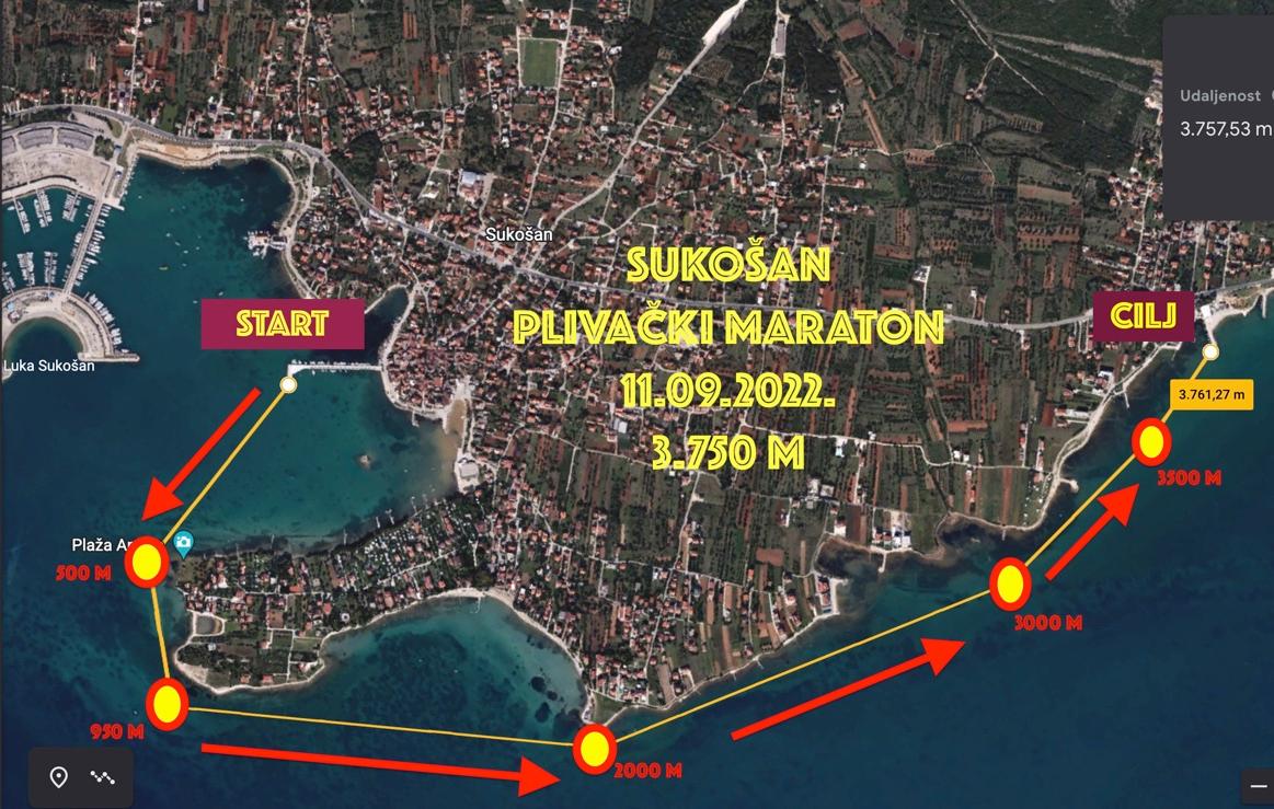 Start će biti na velikom mulu u Sukošanu u 09:00, a cilj na plaži Makarska (La Bocca beach bar). Start će biti iz mora, pliva se pravocrtno, a staza će biti označena s 5 žutih bova, pored kojih se prolazi lijevim ramenom. Cilj će biti označen natpisom CILJ na mulu na plaži Makarska, a ulazak u cilj snima se video kamerom.
