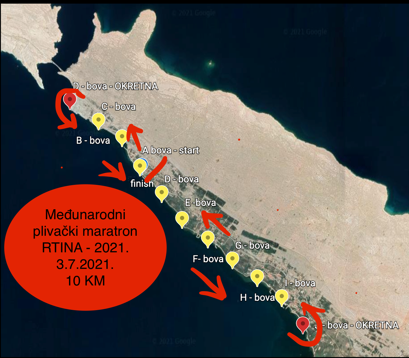 1. Međunarodni plivački maraton Rtina 2021. održava se cijelom rivijerom Rtine u Općini Ražanac. Staza je pravocrtnog oblika na kojoj je postavljeno 11 bova od kojih je 9 žutih, a dvije crvene okretne. Pliva se obrnuto od kazaljke na satu i sve žute bove se prolaze lijevim ramenom, a crvene također lijevim ramenom ali se okreću za 180 stupnjeva. Starta se iz mjesta Miletići i pliva prema Paškom mostu (sjeverozapad). Na zadnjoj crvenoj bovi (C – bova) lijevim ramenom okreće za 180 stupnjeva i kreće natrag (jugoistok). Završetak utrke je kad se uđe nakon 10.000 metar u lijevak i dotakne natpis FINISH. Okrijepa za plivače moguća iz brodica, usidrenih i označenih na 8 mjesta: A-bova = 3 km, F – bova= 4/9 km, H –bova5/8 km, J – bova 6/7 km i K –bova okretna= 6.5 km.