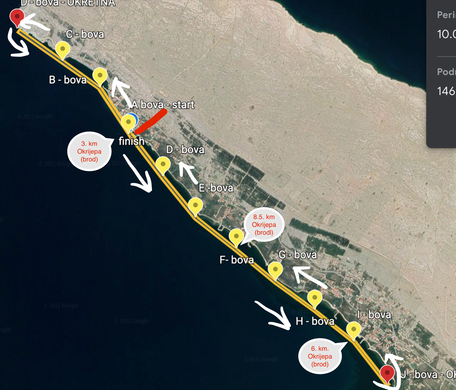 - Dužina staze je 10.000 m, a pliva se u prema paškom mostu pa prema Rtini-Miočićima i natrag (u štap).